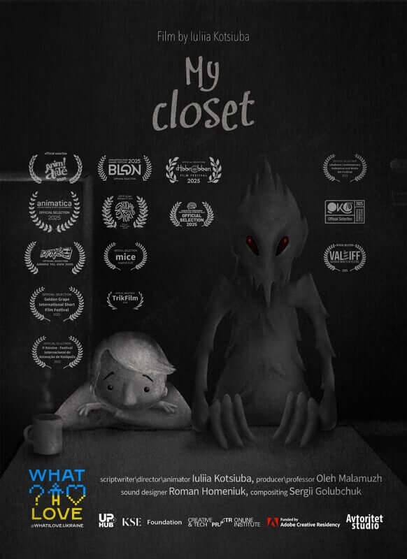 Logline Under the influence of tragic circumstances, the young woman is forced separate with her husband. While doing ordinary things and maintaining contact with her lover, she tries to overcome her fear and despair. Will she be able to cope with her feelings if the connection is lost? Synopsis A young couple wakes up at night to the sounds of explosions. The war has begun… Releasing her husband to defend his country and family, the woman is overcome by fear and sadness. But the news from her lover forces her to resist emotions and try to “hide” her fear in the closet. While trying not to think about the bad, she does her usual things – water the flowers, have breakfast and enjoy the sunny day. The connection with her lover supports and gives her strength, creating the illusion of confidence in tomorrow. One day, the young woman does not receive news from her husband. She awaits with hope, constantly checking her phone. Her courage and confidence fade. There is nothing left in her life except waiting. At this moment, the monster that has been "living" in the closet all this time breaks free and pulls the girl into a crazy dance of fear. He circles, grabs and pulls her into his black abyss. Night time. The girl is sitting at the table in front of a cup of hot tea. The monster is right next to her, he is hugging the girl gently. She no longer hides her fear, they now live together.
